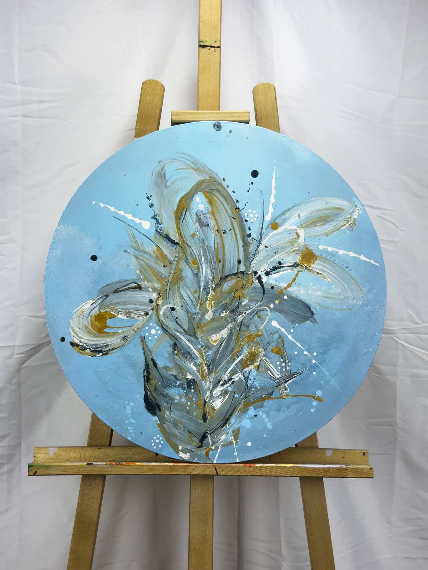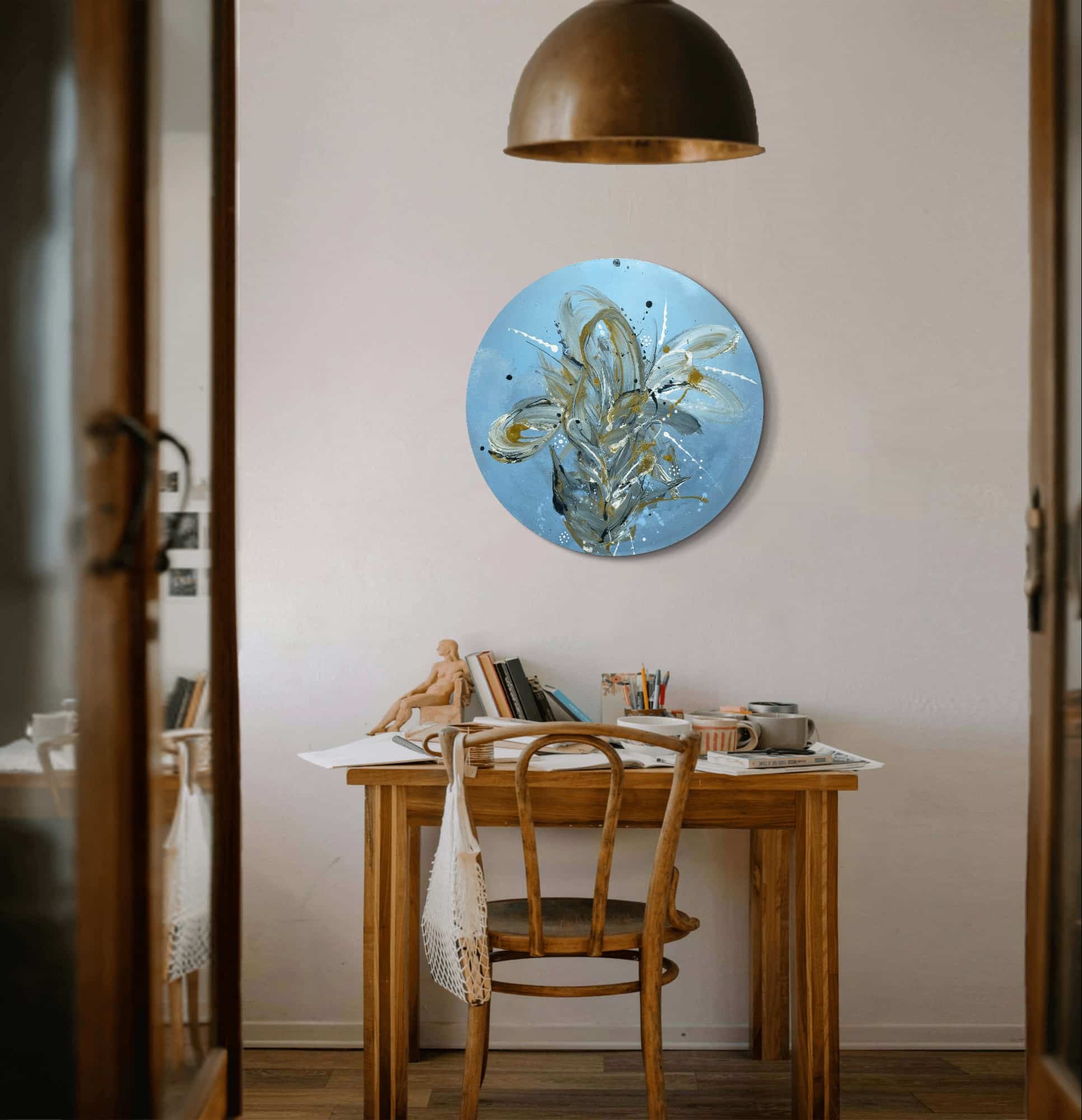 Ručně malované abstraktní obrazy pod názvem: Azurová extáze. V obraze se ocitáme v nádherném světě modrého nebe a zářícího slunce. Celé plátno je jako pohled do azurového ráje, kde se modrá barva rozzáří jemnými odlesky, jako když se sluneční paprsky odrážejí na hladině moře.
