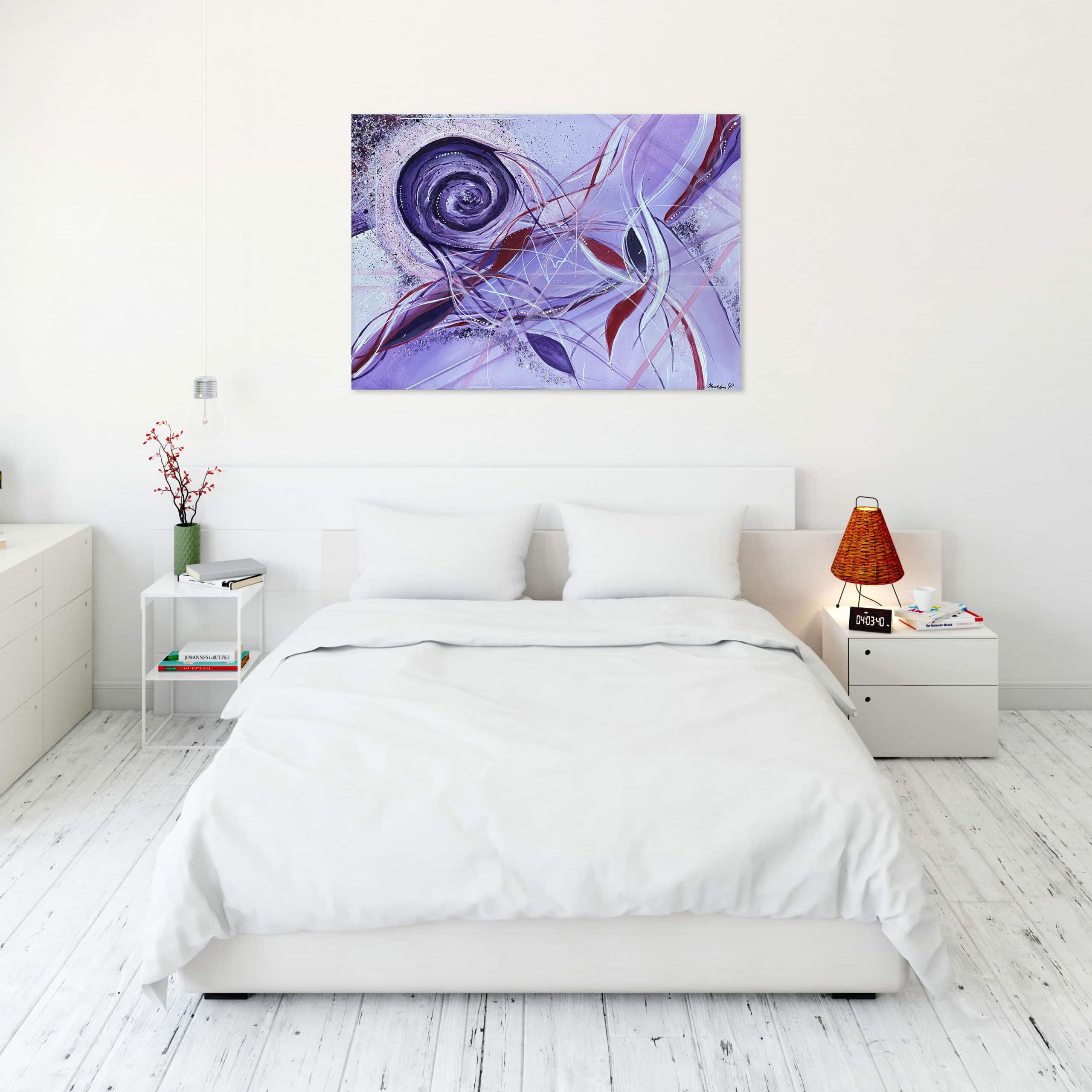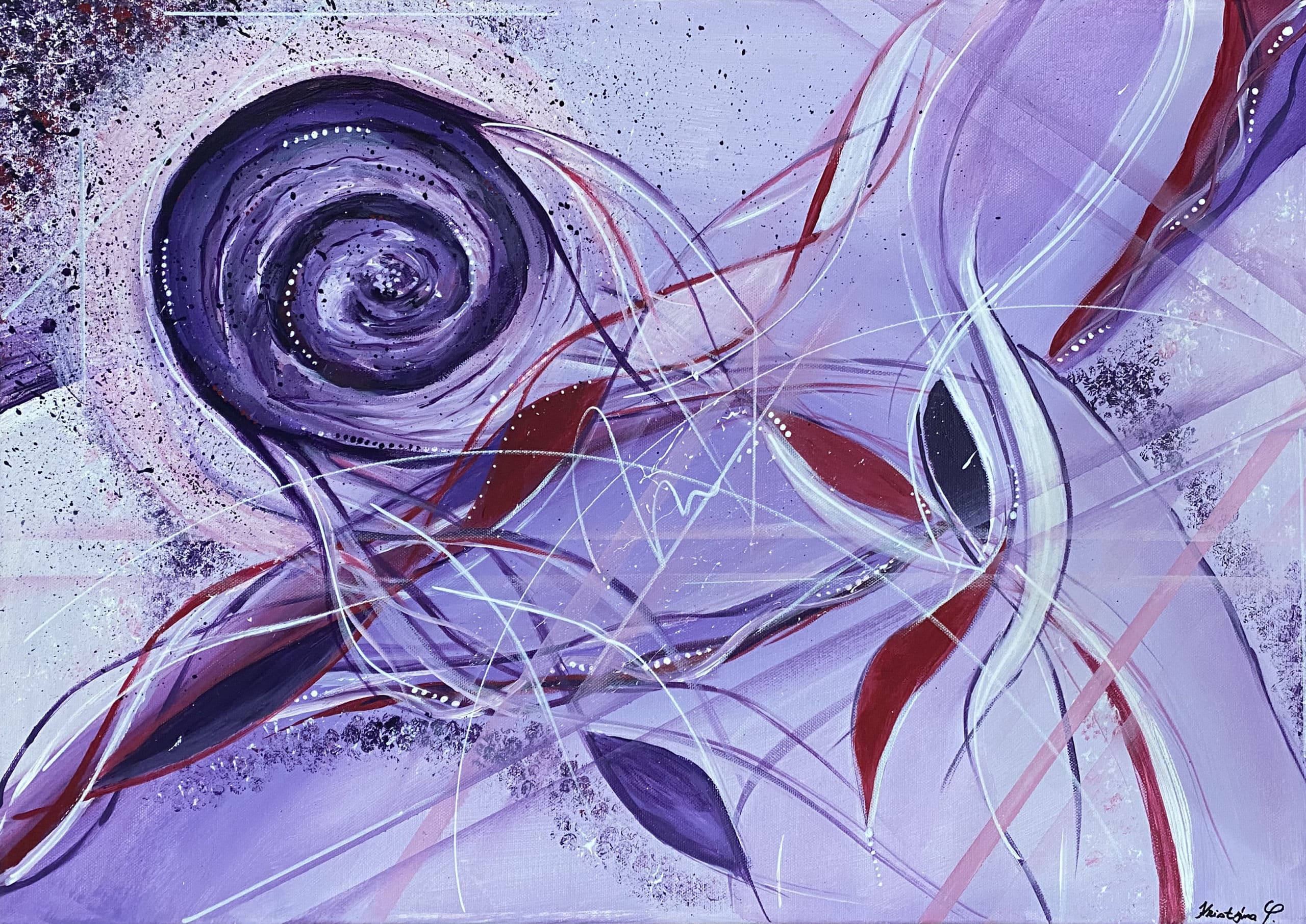 Ručně malovaný abstraktní obraz pod názvem: Fialový sen. Jedná se o obraz na plátně, který reprezentuje abstraktní hledání rovnosti a upřímnosti.