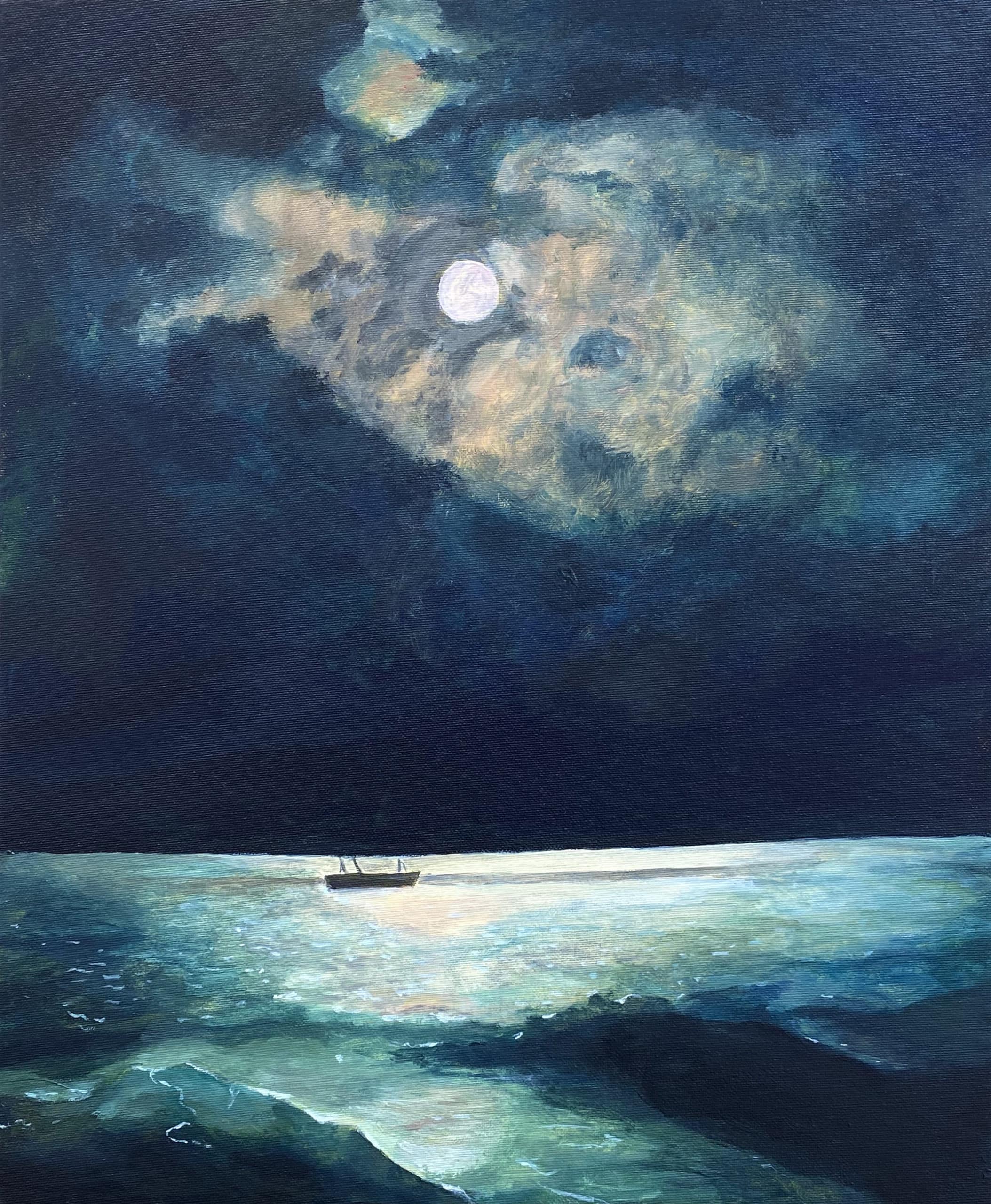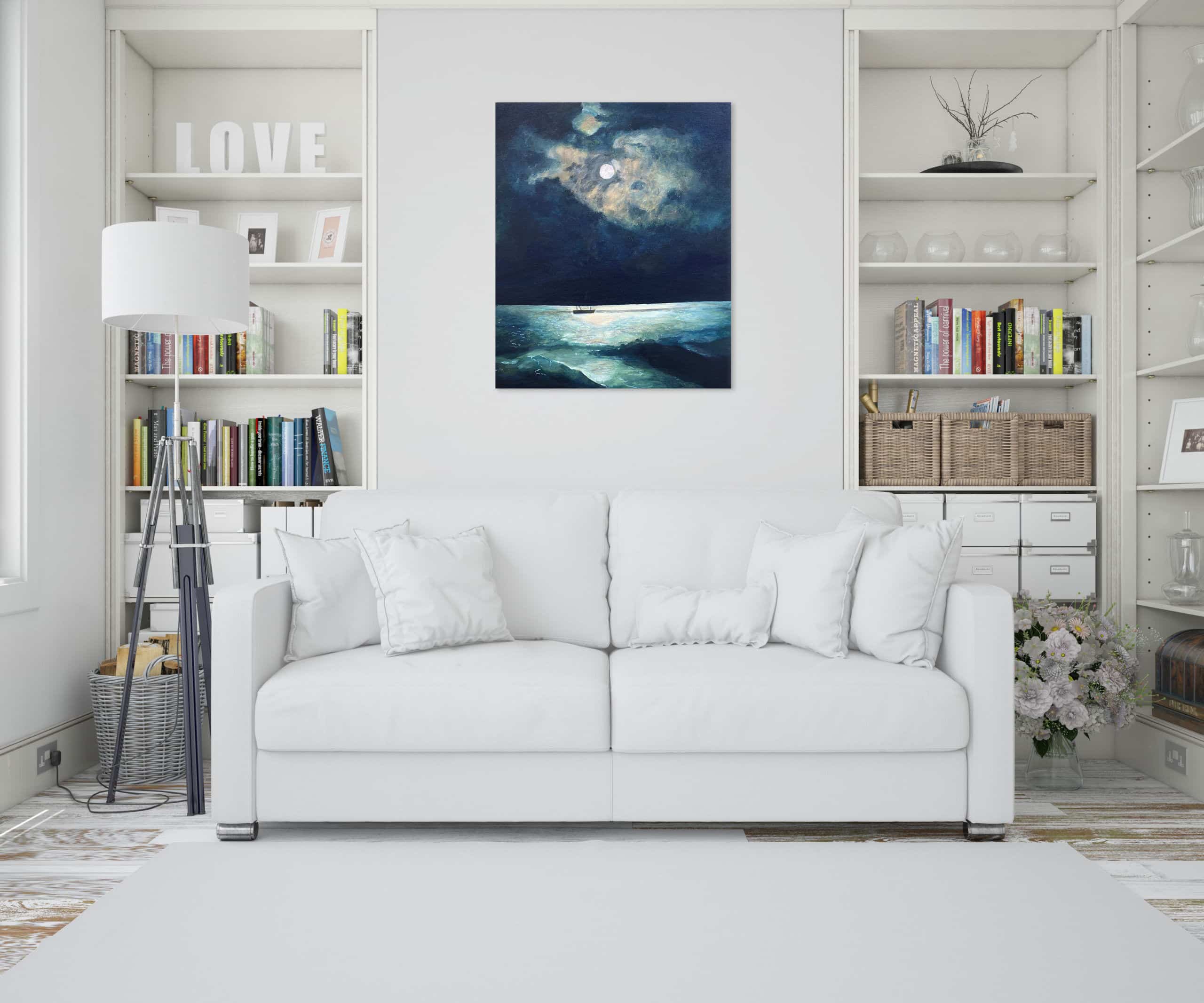 Ručně malovaný abstraktní obraz pod názvem: Měsíční svit. Jedná se o obraz na plátně, který nás zavede na noční plavbu na otevřeném moři. Lodička se klene nad tichou hladinou, zatímco jasný měsíc v nebi svítí jako průvodce na této tajemné cestě. Modré odstíny barvy evokují klid a mystiku noci, zatímco měsíční svit rozsvěcuje scénu. Tato malba zprostředkovává výjimečný moment klidu a odpočinku na moři, kdy čas zpomaluje a příroda se stává naším společníkem. Měsíc na obloze nám připomíná sílu přírody a harmonii ve světě kolem nás. Je to obraz, který nás zvěčňuje v nádherném okamžiku nočního ticha.
