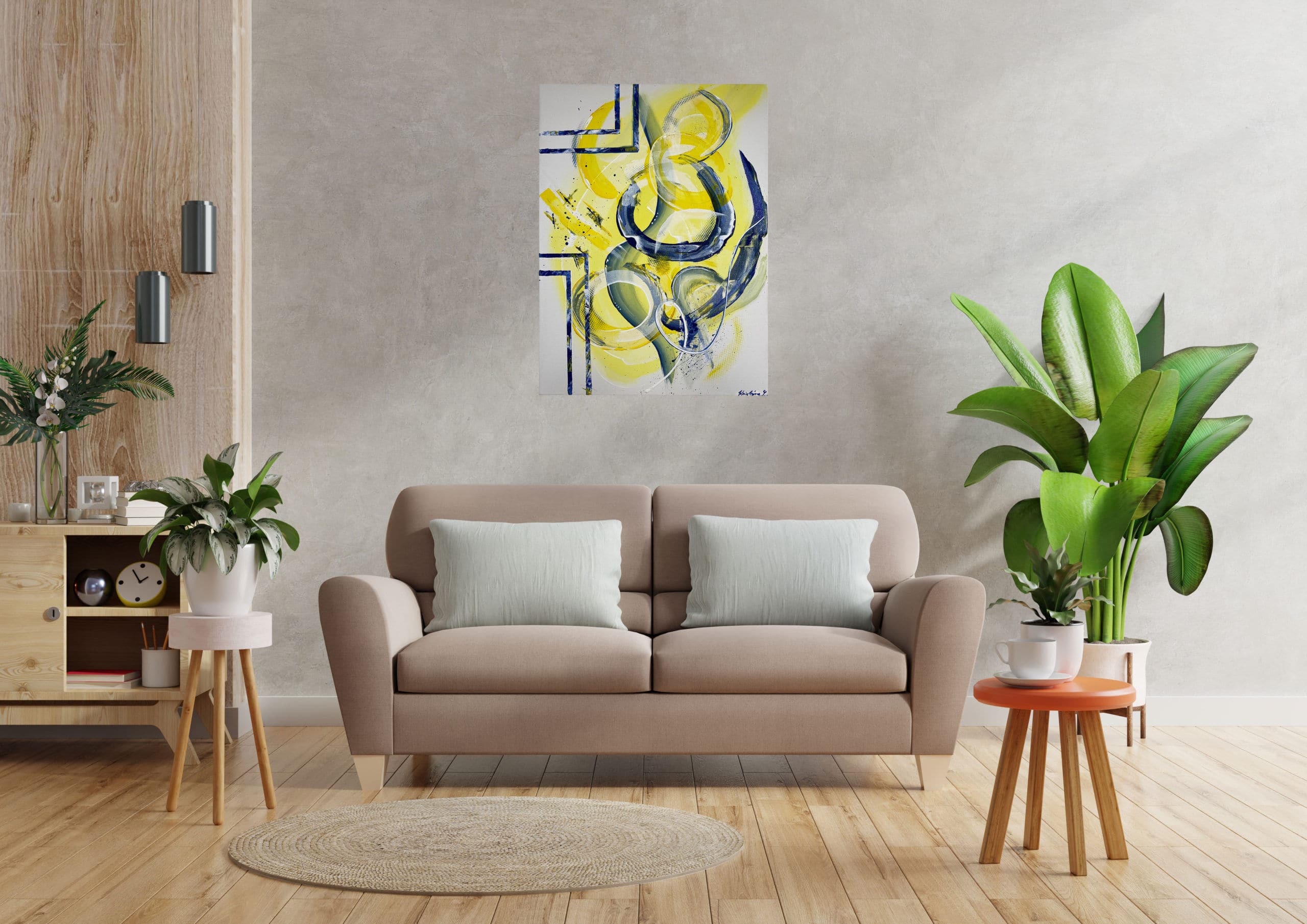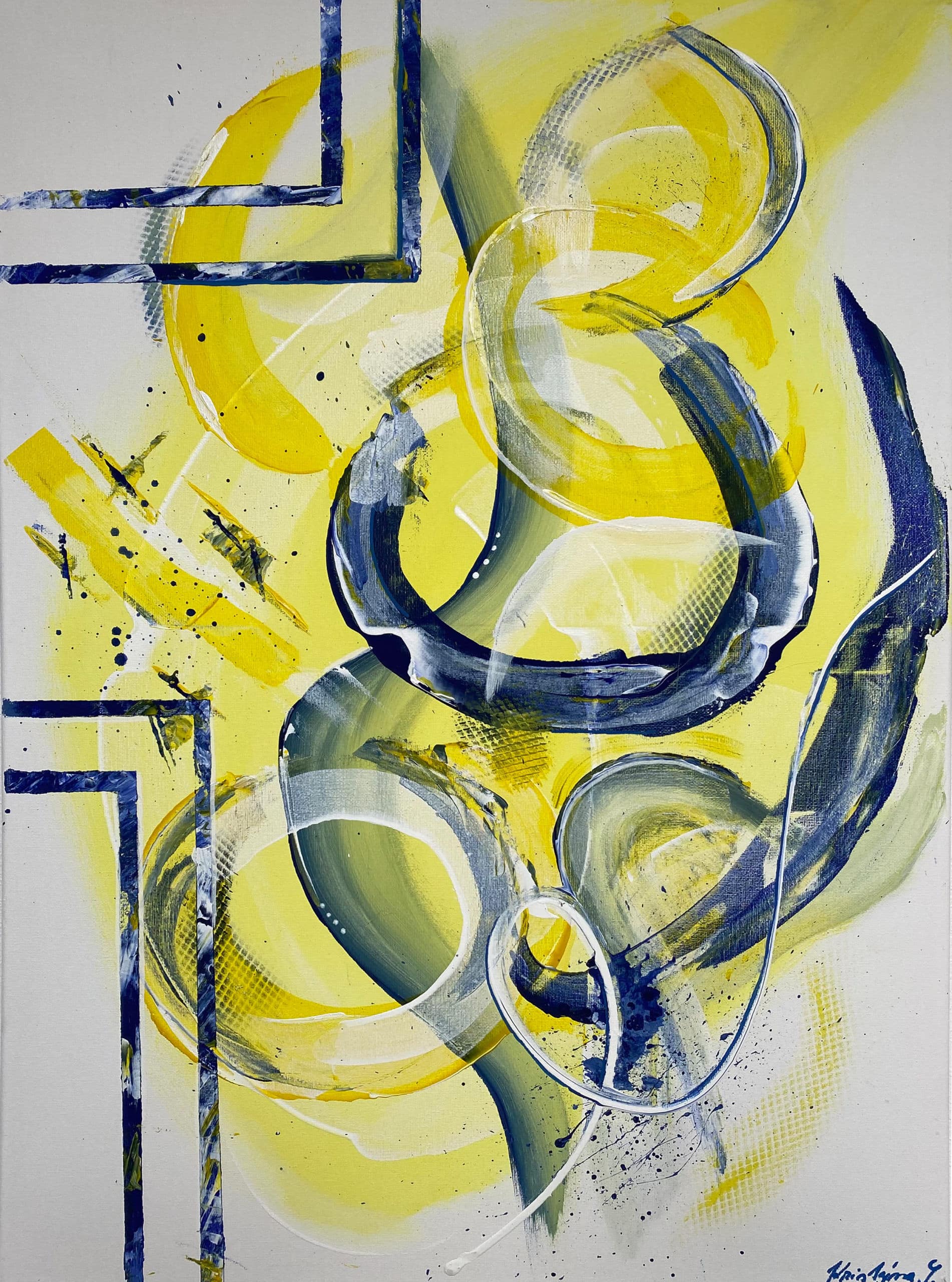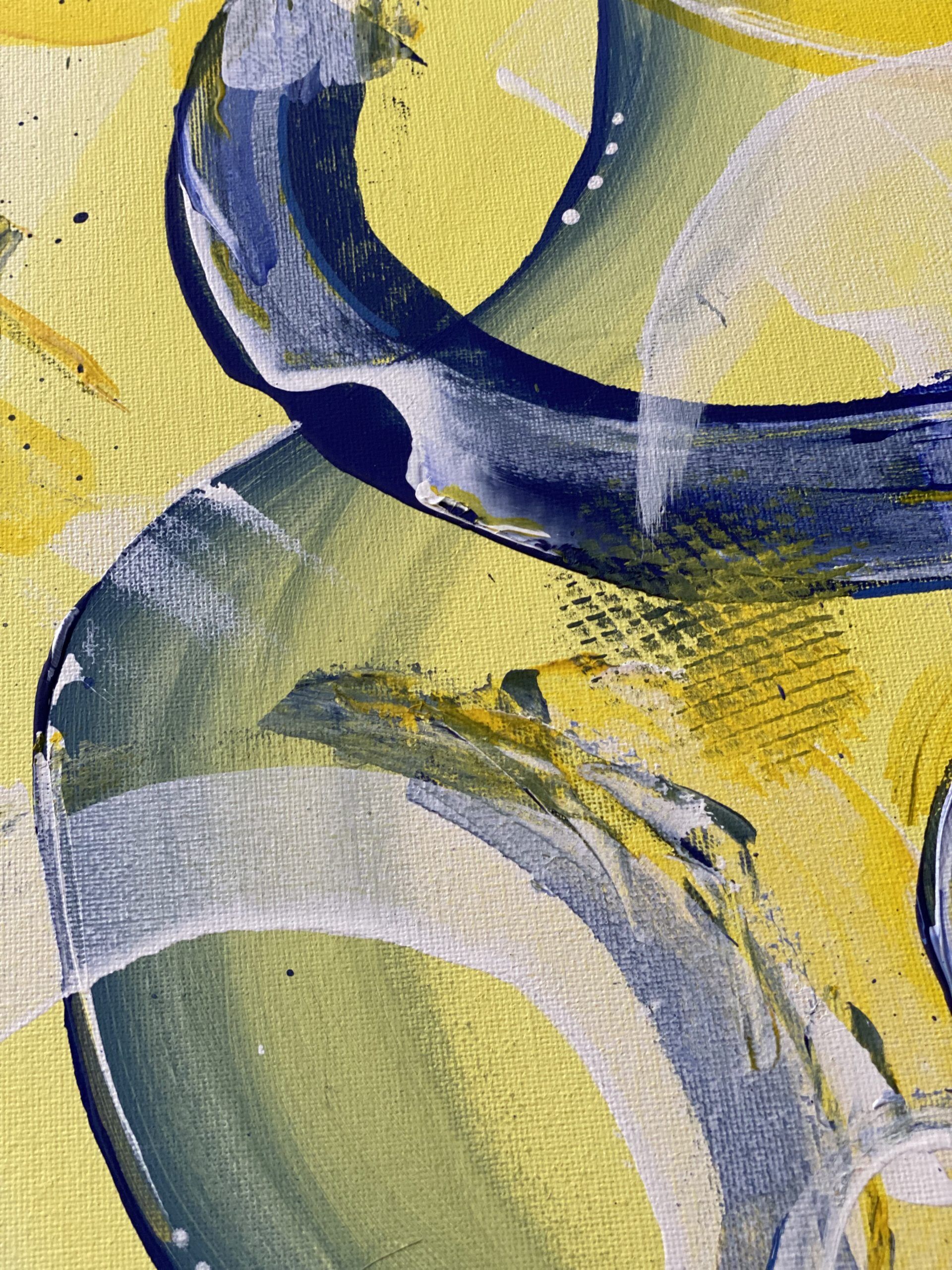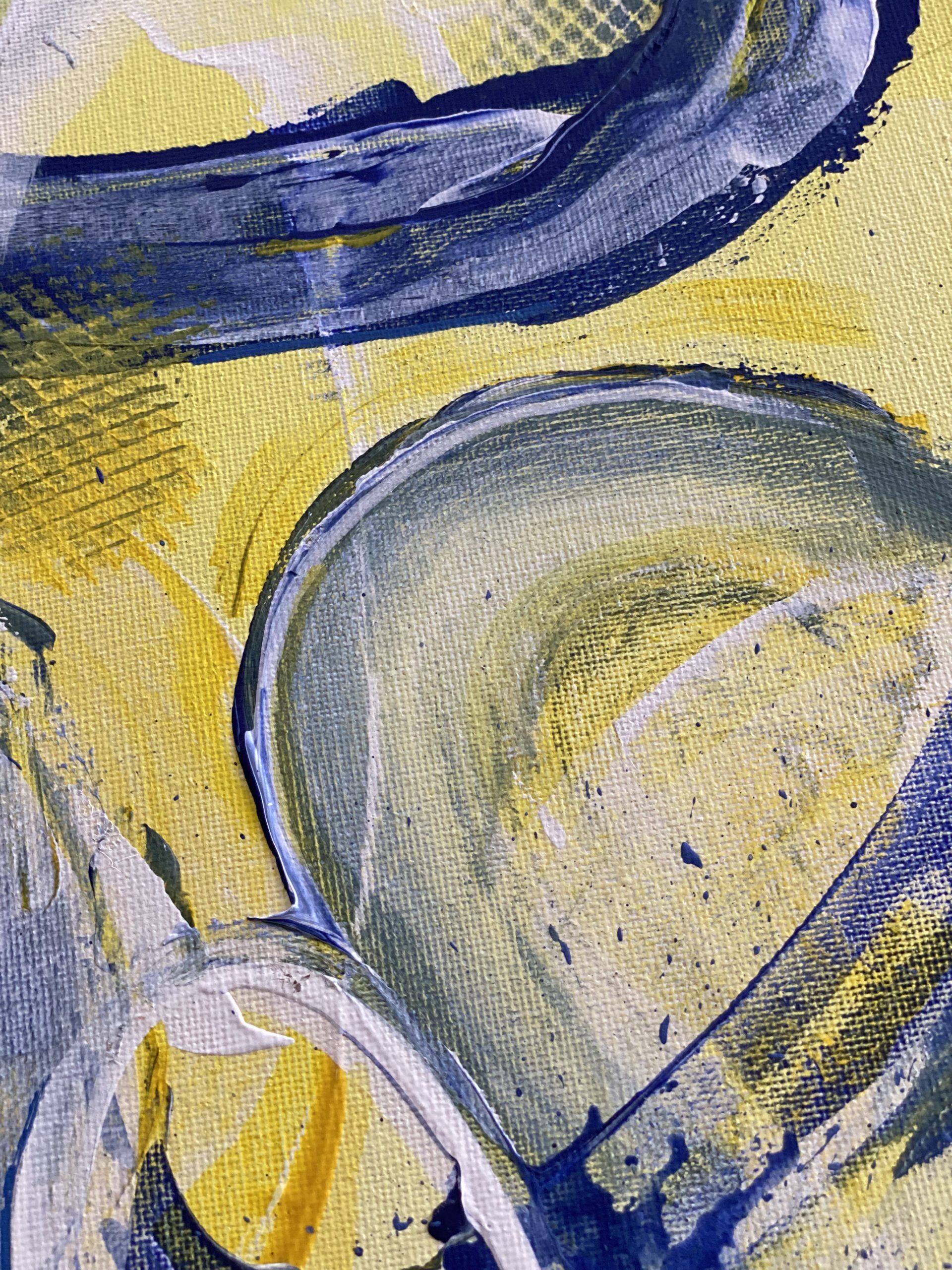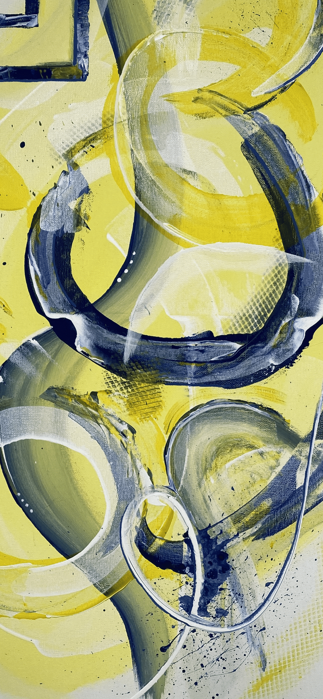 Ručně malovaný abstraktní obraz pod názvem: Proplouvám. Jedná se o žluto-modrý obraz na plátně, kde živé kruhy pulsují jako rytmické vlny v oceánu. Žlutá barva symbolizuje jas a radost, zatímco modrá evokuje klid a hloubku. Kruhy na plátně jsou jakoby notami tance, vytvářející elegantní choreografii, která zhmotňuje pocity svobody a plynutí času. V této abstraktní kompozici se setkává dynamika s klidem, vytvářející prostor pro meditaci a uvážení.